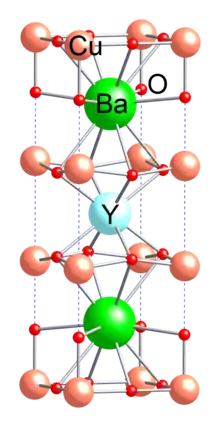 The most famous of these is yttrium barium copper oxide, YBa2Cu3O7−x (or Y123), the first superconductor found with a critical temperature above the boiling point of liquid nitrogen.[7] Its molar ratio is 1 to 2 to 3 for yttrium, barium, and copper and it has a unit cell consisting of subunits, which is the typical structure of perovskites. In particular, the subunits are three, overlapping and containing an yttrium atom at the center of the middle one and a barium atom at the center of the remaining ones. Therefore, yttrium and barium are stacked according to the sequence [Ba-Y-Ba], along an axis conventionally denoted by c, (the vertical direction in the figure on the right).