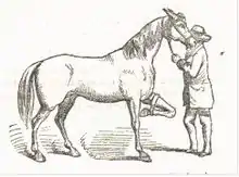 Rarey began by tying one of the traumatized horse's legs with a strap so that the horse could not stand on it. This gave him control over the horse and quickly tired the animal out. Then, Rarey would gently but firmly cause the horse to lie down on a comfortable surface. Once the horse was lying on its side, Rarey could use his weight, concentrated at a strategic point, to keep the horse from rising. While the horse was thus unable to protect itself, Rarey showed it that it was still entirely safe with him by touching and stroking it on all parts of its body. The result was that the horse learned that it could be entirely safe in Rarey's company, and from that beginning it was relatively easy to demonstrate to the horse that it did not need to protect itself from most other humans.[1]