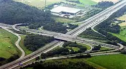 The Breitscheid motorway junction in Ratingen, looking east from west. It connects A 3 (below), A 52 (above) and A 524 (not visible outside the picture above left)