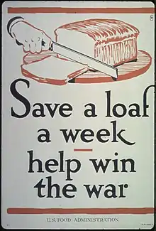 Although the United States did not have food rationing in World War I, it relied heavily on propaganda campaigns to persuade people to curb their food consumption. Propaganda was targeted disproportionally towards middle class white women and their organization provided some of the most substantial support to Hoover's program to limit consumption.[2] Women's groups, like the Women's committees of the State Council of Defense organized in a variety of ways to try to provide relief to the shortages. In Wisconsin, they organized to can and preserve the food that grew in the garden of unoccupied houses.[3] Some states also implemented their own programs to help conserve food which was limited due to the war. In Wisconsin, the Council of Defense asked wholesale bakers to sign a pledge guaranteeing they'd keep bread on the shelves for longer durations.[3]