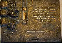 In 2003, the City Council of Madrid paid tribute to Ratón Pérez with a commemorative plaque at the façade of Number 8 Calle del Arenal, where the mouse was said to have lived.[6] The plaque reads: "Here lived, in a box of cookies at Prast confectionery store, Ratón Pérez, according to the story that the father Coloma wrote for the child King Alfonso XIII". He thus became the first fictional character honored with a plaque by the City Council. Inside the building, where there are now several shops and offices, another plaque and a small bronze statue were also installed.