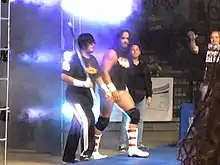 This feud continued when González teamed with Richard Philipo (known as Xix Xavant) to defeat Pérez and Hernández, but after this match another storyline was started, when both were assaulted by a trio of masked wrestlers known as "La Revolución".[6] The main date of Summer Madness, González joined his father to wrestle Colón and one of the members of this group.[7] The following night he faced a member of La Revolución, the result of which led to a handicap match where he and José Vázquez defeated this wrestler.[8] González and Vázquez teamed again in a match for the WWC World Tag Team Championship but after the latter left the ring and was replaced with Víctor Ortiz (known as Mike Mendoza) their win was revoked.[9] On August 15, 2015, he officially teamed with Ortiz and won a rematch for the titles.[10] The team retained the championship for two weeks, when they dropped them back in a rematch. He was then involved in a storyline where Wilkins Nuñez (known as Joe Bravo) returned to the promotion and sought to retire all second generation wrestlers, with the latter winning an encounter between both by employing illegal tactics. On September 26, 2015, González defeated the third member of La Revolución.[11] He dropped the title to Nuñez on October 17, 2015, after his opponent used the same illegal tactics as before.[12]