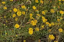 This species is an annual herb which generally remains small in its native habitat but in cultivation may be much larger.[3] It grows from a taproot. The small leaves are linear or lance-shaped and just a few millimeters wide. The flower heads contain several yellow ray florets which may reach nearly a centimeter in length.[4] The plant has a scent like camphor. Flowering occurs in October and November.[3]