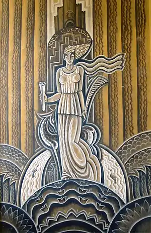 The Paris architects Charles Duval and Emmanuel Gonse took charge of the reconstruction of the town hall in 1927; it had been almost totally destroyed in 1918. They rebuilt it in the original "Flemish" style but using bricks and concrete and much of the interior decoration was carried out in the "Art deco" style. The exterior of the building was decorated with Montdidier's motto "Urbs cultissima", the arms of the town and reproductions of the Légion d'Honneur and la Croix de Guerre. On the façade they commissioned Couvègnes to execute bas-reliefs depicting "les techniques", "les arts", "L'évolution du progrès" and the riches of the Santerre region whilst Maurice Pico was commissioned to execute some paintings. Couvègnes also executed a Marianne for the interior and sculpted the head of a child for the keystone (clé de voûte).[28]