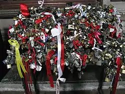 One particular devotion is centered around the padlock that is part of his martyrdom. Locks are placed at his altar representing a prayer request to end gossip, rumours, false testimonies and other sins of the tongue. The locks are used as a visible sign of such prayer request, which first and foremost must take place interiorly, a prayer to God through St. Raymond's intercession.[14]