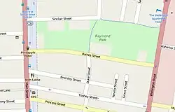 Raymond Park is roughly rectangular in shape and bounded by Main Street to the west, Wellington Street to the east, and Baines Street to the south, and Sinclair Street in part to the north. The irregularity in shape is due to the presence of the Pineapple Hotel in the south-west corner and housing at other locations, presumably existing prior to the establishment of the park. Note Baines Street is named after Edward Joseph Baines, a mayor of Brisbane who was the publican of the Pineapple Hotel.