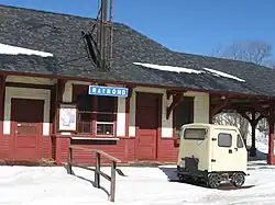 Raymond was first served by a railroad in 1850, when the Portsmouth and Concord Railroad opened service. Its first station burned in 1878 and was soon rebuilt, but also burned in an 1892 fire that leveled much of the village center. The present building was built in 1893 by the Boston and Maine, which had acquired the Portsmouth and Concord.[2] The Raymond Historical Society restored the depot building and keeps a locomotive, a boxcar, a caboose, and a work car on display nearby.[3]