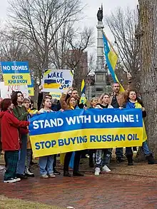 UK Prime Minister Boris Johnson among others has warned of the danger of "Ukraine fatigue" and "stressed the importance of allied nations showing they would stand by Kyiv for the long-term."[58][59] According to the Rand Corporation, "Russia's strategy seems to be largely based on protraction: Let the war grind on, and eventually the United States and its allies will lose interest, and the Ukrainians will cave."[60] Several European newspapers, working from leaked Russian intelligence documents and social media photos, described Russian efforts to exaggerate anti-Ukraine sentiment by photographing a few protestors holding anti-Ukraine signs against a backdrop of large demonstrations about other matters.[61][62]