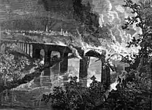 Violence broke out on July 22, 1877, when a car filled with roof shingles was set ablaze on a railroad siding, near the corner of Elm Street and 7th Street.[lower-alpha 2] A crowd of over two thousand people took the depot, and burned "two cabooses, seven freight cars, and the watch house at the Reading and Lehigh Railroad junction at Bushong’s Furnace".[7][lower-alpha 3] As a result of the ongoing unrest throughout Pennsylvania, the state militia was assembling to travel to the Pennsylvania State Capitol in Harrisburg, under order of the governor. In order to prevent the militia from reaching the capitol, a group of rioters set fire to the Lebanon Valley Branch bridge over the Schuylkill River. The bridge was completely destroyed, with only the brick piers remaining. Rail travel with Harrisburg was blocked, the telegraph lines were damaged, and the debris halted passage both up and down the Schuylkill.[10] The damage was estimated at $150,000 (equivalent to $4,122,000 in 2022).[11][lower-alpha 4]