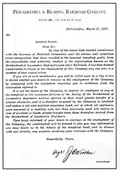 Reading had seen strikes for a time. In early 1877, members of the Brotherhood of Locomotive Engineers and Trainmen had requested a raise. When the railroad refused, and "the men had no choice but to strike", the railroad effectively crushed the trade union. They issued a letter telling their employees that, of those who were members of the Brotherhood, "It has been deemed unadvisable to retain in the employment of this Company any one who is a member of that organization," issuing an ultimatum that they would either leave the union or lose their jobs. Many citizens of Reading were subsequently fired and blacklisted. Others who were still employed by the company were owed back wages, and had not been paid since the end of strikes in May, but they were eventually paid on July 20.[7][8][lower-alpha 1]