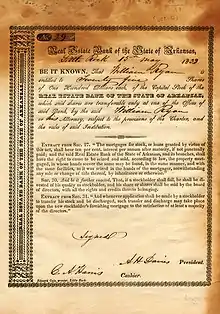 Support for a state bank in Arkansas began during the time of the Arkansas Territory.[1] This was considered a priority due to a lack of banking west of the Mississippi River, a shortage of coins in the region, and few banks in the area being allowed to issue paper money.[2] After Arkansas became a state, the 1836 establishment of the Real Estate Bank of Arkansas was the first piece of legislation passed by the new government. Politically, the bank was widely supported. Two Whigs, Anthony H. Davies and John Ringgold, produced the charter for the bank, and the legislature that approved its creation was controlled by the Democratic Party.[1] The bank's officials were of a Democrat-to-Whig ratio that was similar to that of the state's population.[3] The enabling legislation required the bank to issue $2,000,000 of bonded indebtedness at five percent,[1] with a maturity in 25 years.[4] The state government appointed a quarter of the bank's board of directors, but took no part in the active management of the organization.[1] Another requirement of the bank was to send reports to the state legislature,[5] and the bank could borrow on the state's credit.[3] The bank was intended to promote the interest of planters,[1] an intention that was stated in the enabling legislation.[5] The banking committee in the state legislature was composed almost entirely of men representing planting areas along rivers, and the voting to establish the bank was only opposed by representatives from northern Arkansas. The interests in the northern portion of the state were somewhat appeased by the establishment of another state bank to have branches in Fayetteville and Batesville.[6]