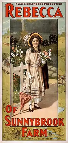 Rebecca of Sunnybrook Farm was dramatized for the theater in 1909. Wiggin co-wrote the play with Charlotte Thompson. It was produced for Broadway by Klaw & Erlanger in 1909.[2] Before opening on Broadway, it toured Boston and New England where it was warmly received.[3]