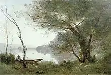 Mortefontaine is a small village in the Oise département in northern France. Corot made frequent visits to the area in the 1850s to study the effects of light and reflection on water. In Souvenir de Mortefontaine Corot was not producing a scene from life, but (as the title suggests) his recollections of his visits and the play of light on the ponds in the village. Corot produced a second similar painting, The Boatman of Mortefontaine (1865–70), which shows the same lake and trees from the same perspective. Changes in the features of the landscape in The Boatman from those depicted in Souvenir hint at the paintings being generalised impressions rather than details captured from life.