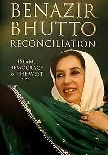 At the time of Bhutto's death, the manuscript for her last book, to be called Reconciliation: Islam, Democracy and the West, had been received by HarperCollins.[1] Mark Seigel had helped Bhutto to research to write this book and he said that Bhutto had been troubled by the way that extremists had hijacked the message of Islam. So she wanted him to compile all the assertions of extremist clerics and terrorists on democracy, pluralism, tolerance and then asked him confer with Islamic scholars and compile the Quranic references to the same subjects and line them out in an array, almost a spreadsheet, against the extremists.[2] The book was published in February 2008.