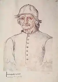 The portraits including a self portrait by Hieronymus Bosch and a double portrait of Philip the Good and Charles the Bold, a copy of Jan van Eyck's Portrait of Baudouin de Lannoy and depictions of Margaret of York and Jacqueline, Countess of Hainaut, all of whom are named in the index contained in folios 1–4, a later addition probably based on notes Le Boucq made on the margins which have since been cut away.[4] The only non-historical portraits are of (the unidentified) Laure de Noves and Petrarch on folio 27I verso. The drawing as are all on black or red chalk on paper. Nine are lost, while only torn fragments remain of a small number of others. It was originally foliated using Roman numerals, this was changed to Arabic numerals by a later scribe.[2]