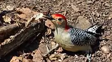 As with all animals, foraging plays an important role in an animal's ability to survive and reproduce. The red-bellied woodpecker expresses foraging behavior by catching or storing food.[18] The woodpecker uses its bill as a chisel, drilling into bark or probing cracks on trunk of trees.[18] In this manner, it is able to pull out beetles and other insects from the tree with the help of its long tongue.[18] This behavior is also seen in storing food from other animals by hiding food behind bark or deep in cracks of a tree.[18] According to studies from Williams (1975),[19] Breitwisch (1977),[20] and Williams and Batzil (1979),[21] the red-bellied woodpecker spent 20% to 69% of its time foraging on dead or decaying trees.[22]: 351 In addition, Breitwisch (1977)[20] observed red-bellied woodpeckers primarily gleaning and probing to find food in South Florida pine habitat.[22]: 351 [23]: 5 The red-bellied woodpecker relies on snags or dying trees for foraging and nesting.[14] It is a major predator of the invasive emerald ash borer in the U.S. Midwest, removing up to 85 percent of borer larvae in a single infested ash tree.[24] The red-bellied woodpecker has also been observed, on occasion, foraging on the ground amongst groups of Northern Flicker woodpeckers.