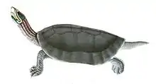 The red-crowned roofed turtle or Bengal roof turtle[1] (Batagur kachuga) is a species of freshwater turtle endemic to South Asia. It was the type species of its former genus Kachuga. Females can grow to a shell length of 56 cm (22 in) and weigh 25 kilograms (55 lb), but males are considerably smaller. The turtles like to bask in the sun on land. In the breeding season, the heads and necks of male turtles exhibit bright red, yellow and blue coloration. The females excavate nests in which they lay clutches of up to thirty eggs.