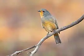 The male has an orange/buff face and throat, a grey breastband extending around the neck and over the head and rufous underparts with pale yellow/olive edging to primaries. Some males are reported having a buff collar.[2][5] The female is similar but with paler throat and underparts with a hint of buff. The eye is red, and bill and legs are dark. They weigh 30-38g and have a length of 19–22 cm. Unlike other whistler species the throat colour of the red-lored whistler extends upwards to include the lores and face, distinguishing it from the closely related and similar Gilbert's whistler (Pacycephalas inornata) which also has a red throat. Females and juveniles of both species are very similar, making them harder to distinguish although the red-lored whistler has a slightly more buff colouring. Field identification is further compounded by the fact that the range of the red-lored whistler fits wholly within that of Gilbert’s whistler. Both species share the same habitat and have similar behaviour and calls. John Gould, who described both species, was not familiar with the Gilbert's whistler at the time he identified the red-lored whistler: this is surprising, as the path that he travelled took him through areas where the Gilbert's whistler is not uncommon. It is possible that, in the absence of specimens, even Gould confused the two species.