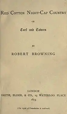 Having been originally told about the case of Antoine Mellerio in 1870 by his friend Joseph Milsand, Browning went on to research the facts with great thoroughness, reading newspaper reports and transcripts of the legal documents and interviewing residents of the district.[2] Browning wrote Red Cotton Night-Cap Country during December 1872 and January 1873, while the lawsuit over Mellerio's will was still under appeal. He originally used the real names of the characters and places in the affaire Mellerio, but on submitting the manuscript to his friend Lord Coleridge, then Attorney-General, he was advised that he might be sued for libel. All the names were accordingly changed: Antoine Mellerio to Léonce Miranda, Anna de Beaupré to Clara de Millefleurs, Saint-Aubin to Saint-Rambert, and so on.[3] The poem was published during the first week of May 1873 by Smith, Elder & Co., but they did not need to reprint it until, in 1889, along with The Inn Album, it formed volume 12 of his Poetical Works.[4]