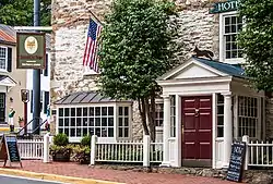 The Red Fox Inn & Tavern, also known as the Middleburg Inn and Beveridge House, is a historic inn and tavern located in Middleburg, Loudoun County, Virginia. According to the National Register of Historic Places placard on the building, the Red Fox Inn was established circa 1728. Some historic artifacts on the building date to about 1830, with additions and remodelings dating from the 1850s, 1890s, and the 1940s. It consists of a 2 1/2 story-with-basement, five-bay, gable-roofed, fieldstone main block, with a two-story, three-bay, gable-roofed fieldstone rear wing. The front facade features a one-story, one-bay, pedimented porch dating from the 1940s. It has a standing seam metal gable roof and exterior end chimneys. The buildings exhibits design details in the Federal and Colonial Revival styles. It is thought to be one of the oldest continuously operated inns in Virginia as well as the United States. The Red Fox Inn & Tavern has served a variety of functions including: stagecoach stop, inn, tavern, butcher shop, apartment house, post office, and hotel.[3]