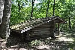 The Red Mountain Shelter is located on the eastern slope of Red Mountain, a 1,652-foot (504 m) hill in the northern part of Mohawk State Forest in eastern Cornwall. It is located along a blue-blazed trail that is a former alignment of the Appalachian Trail, north of Connecticut Route 4. It is a small log structure, with a gabled roof and dry-laid fieldstone foundation. The rectangular structure, open on one side, is built out of saddle-notched logs, with a milled lumber sill at the base of the opening for stability.[2]