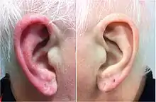 - ↑ Brill TJ, Funk B, Thaçi D, Kaufmann R (December 2009). "Red ear syndrome and auricular erythromelalgia: the same condition?". Clin. Exp. Dermatol. 34 (8): e626–8. doi:10.1111/j.1365-2230.2009.03342.x. PMID 19489849. S2CID 22614591.