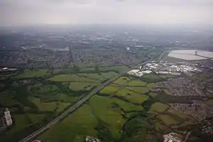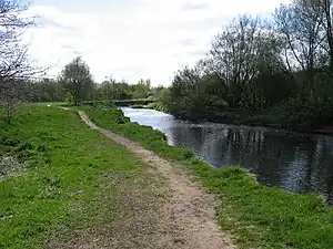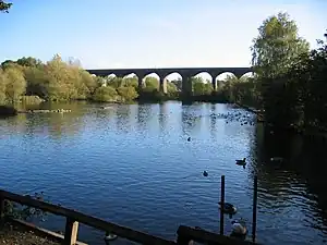 Highly visible from the visitors' centre is the 16-arch brick viaduct built in 1875 to carry the Hope Valley Line over the Tame Valley.[1][4] There is a legend that during construction a local witch cursed the viaduct and anyone who counted the number of arches.[5] A railway line once led to Stockport from Reddish Junction at the Brinnington (east) side of the viaduct. This line has been turned into a public bridleway joining the two parts of the country park and forms a section of the Trans Pennine Trail. The Stockport–Stalybridge line forms part of the western boundary of the vale. A spur once ran to the colliery at Denton. Its position is still visible in places marked by a hedgerow that runs alongside Ross Lave Lane.