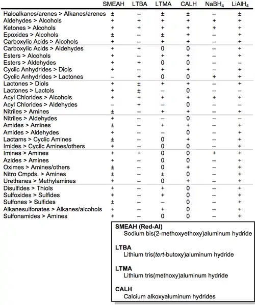 The table below summarizes the reductions that may be carried out with a variety of metal aluminium hydrides and borohydrides. The symbol "+" indicates that reduction does occur, "-" indicates that reduction does not occur, "±" indicates that reduction depends on the structure of the substrate, and "0" indicates a lack of literature information.