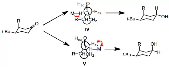 Diastereoselectivity in reductions of cyclic ketones has also been studied. Conformationally flexible ketones undergo axial attack by the hydride reagent, leading to the equatorial alcohol. Rigid cyclic ketones, on the other hand, undergo primarily equatorial attack to afford the axial alcohol. Preferential equatorial attack on rigid ketones has been rationalized by invoking "steric approach control"—an equatorial approach of the hydride reagent is less sterically hindered than an axial approach.[17] The preference for axial attack on conformationally flexible cyclic ketones has been addressed by a model put forth by Felkin and Anh.[18][19] The transition state for axial attack (IV) suffers from steric strain between any axial substituents and the incoming hydride reagent. The transition state for equatorial attack (V) suffers from torsional strain between the incoming hydride reagent and adjacent equatorial hydrogens. The difference between these two strain energies determines which direction of attack is favored, and when R is small, torsional strain in V dominates and the equatorial alcohol product is favored.