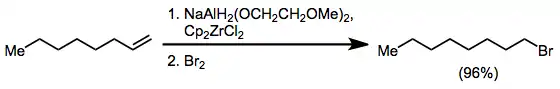 Alkenes undergo hydroalumination in the presence of some alkoxyaluminium hydrides.[26] In a related application, NaAlH2(OCH2CH2OCH3)2 (sodium bis(methoxyethoxy) aluminium dihydride, SMEAH or Red-Al) reacts with zirconocene dichloride to afford zirconocene chloride hydride (Schwartz's reagent). Alkenes undergo hydrozirconation in the presence of this reagent, affording functionalized products after quenching with an electrophile.[27]