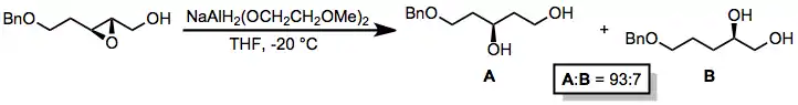 Epoxides are generally attacked by alkoxyaluminium hydrides at the less substituted position. A nearby hydroxyl group may facilitate intramolecular delivery of the hydride reagent, allowing for selective opening of 1,2-disubstituted epoxides at the position closer to the hydroxyl group.[24] The configuration at the untouched epoxide carbon is preserved.