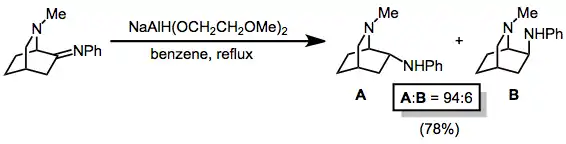 Imines are reduced by metal alkoxyaluminium hydrides to the corresponding amines. In the example below, use of the exo amine forms with high diastereoselectivity. The selectivity of hydride reduction in this case is higher than that of catalytic hydrogenation.[30]
