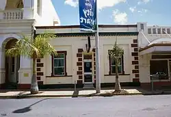 The single storeyed brick building is elongated in form and consists basically of the original hip roofed section of the building at the front with a long gable roofed extension at the rear. The symmetrical facade of the building is cement rendered and strongly modelled with quoin work at each corner and around the front entrance. The original window and door frames have been replaced with modern aluminium style fixtures. Both windows have moulded architraves. A deep cornice together with dentils runs the full width of the building. The roof of the building is hidden from the street by a simple parapet. Internally the original section of the building consists of a central tiled corridor that provides access to three small carpeted offices on both sides. Most of the existing partition walls are original, as is much of the timber architraving. The acoustic ceiling throughout this section is suspended and is positioned approximately 600 millimetres (24 in) below the original. The original rear brick wall is currently painted and former window openings have been sealed. The original brick lined vaulted safe still survives.[1]