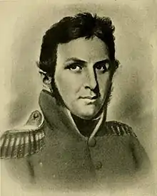 During the ensuing fight, Forsyth needlessly exposed himself by stepping on a log to watch the attack and was shot and killed.[29][27] Forsyth's riflemen, still hidden and now enraged over the death of their commander, rose from their covered positions and fired a devastating volley.[29][27] The British were surprised by the ambush and retreated in confusion, leaving seventeen dead on the field.[29][27] Forsyth was the only American casualty.[29][27] Even though Forsyth was killed, his feigned retreat and ambush succeeded at inflicting heavy casualties on the British force.[29][27]