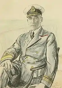 Tyrwhitt also led the British naval forces during the Cuxhaven Raid in December 1914, when British seaplanes destroyed German Zeppelin airships, and at the Battle of Dogger Bank in January 1915, in which action Tyrwhitt again supported Beatty's powerful battlecruiser squadron.[8] During the Battle of Jutland in May 1916, the Admiralty held back Tyrwhitt's forces in case of a German attack on the coast.[8] Tyrwhitt was awarded the Distinguished Service Order on 3 June 1916,[9] appointed a Commander of the French Legion of Honour on 15 September,[10] and made a naval aide-de-camp to the King on 21 May 1917.[11] He was also advanced to Knight Commander of the Order of the Bath on 15 July 1917,[12] and appointed an Officer of the Military Order of Savoy on 11 August.[13]