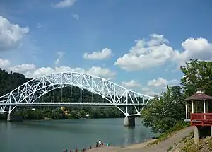 The Regis R. Malady Bridge, commonly known as the Elizabeth Bridge, is an arch bridge that carries vehicular traffic across the Monongahela River between Elizabeth, Pennsylvania and West Elizabeth, Pennsylvania. The bridge features freeway ramps at either end, with an exit to Third Street in Elizabeth (signed as Elizabeth/Glassport) on the south bank and exits for Route 837 North to Clairton and Route 837 South to West Elizabeth on the north bank. This bridge replaces an 1893 arch structure that crossed at Plum Street. The bridge was renamed in 1985[2] after Regis Malady, a former Democratic member of the Pennsylvania House of Representatives whose district included a number of Mon Valley communities.