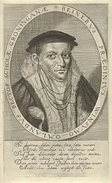 Regnerus Praedinius or Reinier Veldman (1510 – 1559) was a Dutch humanist, rector, reformer, and teacher. The Praedinius Gymnasium in Groningen is named after him. Johannes Acronius Frisius, Volcher Coiter, and Abel Eppens were among his students. He was born in Winsum as Reinier Veldman. He studied theology at the Fraterhuis in Groningen, and at Leuven, before becoming the rector of the St. Maartens school. He began to find problems in the Catholic Church and sought to reform the system. He was an admirer of Desiderius Erasmus. He later Latinized "Veldman" (or field man) using the word praedium to Praedinius. Reinier was likewise altered through the word "regnare" (to govern) to Regnerus.[1]