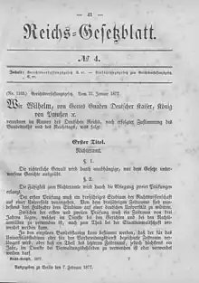 In 1871, the court attained minor additions to its subject-matter competence. It was now also responsible for the law of the Flösserei (timber rafting), some copyright law and tort liability concerning the operation of railways.[19] After the defeat of France in the Franco-Prussian War, Alsace–Lorraine became part of the German Empire. This territorial gain started the process of expanding the court's subject-matter jurisdiction beyond the confines of commercial law.[20] Shortly after the war, a law dated 14 June 1871 was passed which established the court as the supreme court for Alsace–Lorraine effective 28 August 1871.[21] The court thereby took the place of the French Court of Cassation in Paris for all cases stemming from this territory.[14][21][22] This was of major importance because the court was now competent to hear criminal cases from this territory and was thus in a position to rule on the new German Criminal Code of 1871.[23]