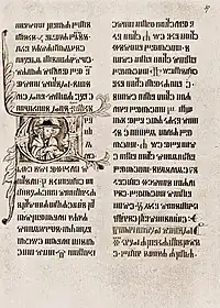 Out of a total of 47 double-sided sheets, 16 sheets are written in Cyrillic (as a fragment) and 31 sheets in the Glagolitic alphabet.[1][2] The book used to have a treasure binding, richly decorated and embellished with gold, precious stones, and relics, among them a fragment of the True Cross.[2] The precious stones and the relics probably disappeared from the book cover during the French Revolution. It features six historiated initials in the Glagolitic part and several ornamental capitals at the start of sections.