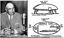 Schmidt was born and grew up in Nebraska, where he worked for most of his adult life as a grain buyer and dealer. In 1938, he was convicted of embezzlement and was imprisoned in the Nebraska State Penitentiary.[2][3] According to Schmidt, on November 5, 1957, while driving through a rural area near Kearney, Nebraska, he saw a large, blimp-shaped object on the ground in a field. He claimed two men left the object and escorted him inside it. On board witnessed a group of four men and two women speaking a language he described as "High German."[4][5] The group claimed to be from the planet Venus. After a conversation lasting about thirty minutes, Schmidt left the craft and it took off into the air, revealing large propellers at each end.