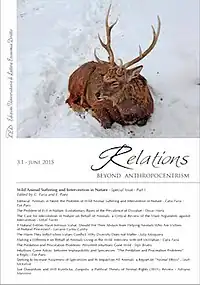 Relations. Beyond Anthropocentrism is an open access peer-reviewed journal focusing on ethics and related topics from a non-anthropocentric perspective. The journal aims to create an interdisciplinary forum within Europe to promote discussion of scientific and moral problems that relate to the need to transcend the anthropocentric nature of existing structures of knowledge.[1] The journal's language is English, but it is published in Italy.[2] The content includes commentary, debates, interviews and reports on conferences, activities, workshops, events and other projects. Submissions are intended to be understood by both an academic and lay audience.[3] Relations. was published biannually from 2013 to 2018, then annually in 2019 and 2020. It is edited by Francesco Allegri, Matteo Andreozzi, Sofia Bonicalzi and Eleonora Adorni. Topics of past issues include animal emotions, animal personhood, antispeciesism, wild animal suffering, posthumanism, animal products and energy ethics.[4]