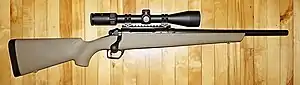 The bolt has forward dual-opposed lugs and is released from the receiver using a lever on its left side, the bolt can be removed with the safety on. The two position safety is located on the right side of the bolt and maneuvered with a thumb lever. On top of the receiver is four mounting holes for scope rails.[4]