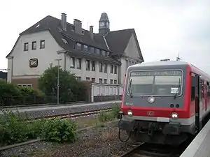 Lennep was soon connected by the branch line to Remscheid (now considered to be part of the Wuppertal-Oberbarmen–Solingen railway), by a link to Krebsoge station on the Wupper Valley Railway (opened on 1 March 1886)[7] and indirectly to the Wipper Valley Railway at Bergisch Born via the line to Wermelskirchen opened in 1876, giving it more rail connections than its neighbouring cities so that it soon became a hub for rail transport in the Bergisches Land. The station had its own locomotive depot from 1893 to 1960.