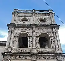 It is characterized by maintaining certain Gothic and Mudejar components within the Renaissance style. The façades are sculpted as if they were altarpieces, and together with the typical Renaissance cushioning, there are columns with grotesques and full of decoration and windows in the Gothic tradition. There is a proliferation of tondos or medallions and coats of arms placed in the keystones of the vaults and in the spandrels of the arches. This is a highly decorative genre. It reached its greatest exuberance in Andalusia. A good example is the façade of the Seville City Hall by Diego de Riaño.[42]