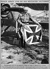 A September 1918 magazine Le Miroir article (no. 251, p. 15) showing Fonck with a German Cross emblem from what is allegedly his 60th victory