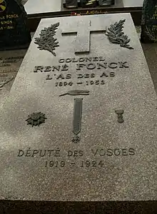 Colonel René Paul Fonck (27 March 1894 – 18 June 1953) was a French aviator who ended the First World War as the top Entente fighter ace and, when all succeeding aerial conflicts of the 20th and 21st centuries are also considered, Fonck still holds the title of "all-time Allied Ace of Aces". He received confirmation for 75 victories (72 solo and three shared)[1] out of 142 claims.[2] Taking into account his probable claims, Fonck's final tally could conceivably be nearer 100 or above.[3] He was made an Officer of the Legion of Honor in 1918 and later a Commander of the Legion of Honor after the war, and raised again to the dignity of Grand Officer.