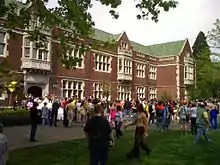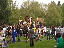 Renn Fayre is an annual three-day celebration that occurs on the campus of Reed College in Portland, Oregon. The festival was originally a one-day Renaissance Fayre, held during the spring semester for the purpose of recreating the Renaissance era.[1] On the final days of class instruction, seniors march from the library to the registrar's office to celebrate the completion of their theses and to receive congratulations from the institution's President.[1] The parade of students begins a weekend festival that has featured a variety of activities and forms of expression, including a fire show, fireworks, food, a giant slide and skate ramp, handicraft, lube wrestling, nude students covered by blue paint known as "Picts", Glow Opera, and other sports.[1][2]