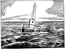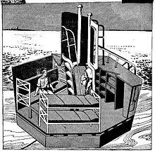 A British equivalent, the Air-Sea Rescue Float was also developed and deployed.[3] They used a boat-shaped hull of welded steel. Sixteen were constructed,[4] and they were deployed under the main routes bombers took to and from continental Europe.[5] They were equipped with cooking facilities, signal flags, a radio and six bunks. Food, blankets, clothing, drinking water and first-aid supplies were carried.[5]