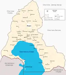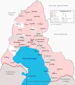After the fall of the Ottoman empire and some population movements Kolonjarë inhabit Gorna Bela Crkva, Dolna Bela Crkva and Asamati.[1] The Albanian population in Resen settled there during the first decades of the 19th century originating from the Yanya vilayet.[2] In contemporary times Muslim Albanians live in small numbers within Resen.[1] A small number of Albanian speaking Muslim Romani used to live in Krani and Nakolec which during the latter decades of the 20th century have migrated to Ohrid and Resen.[1]