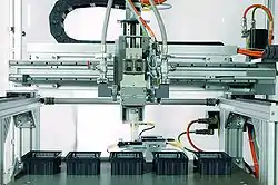 For the production of series, dispensing systems with multifold metering heads can be used. At this time (2006) there are systems running capable to do up to thirty dispensing acts simultaneously.